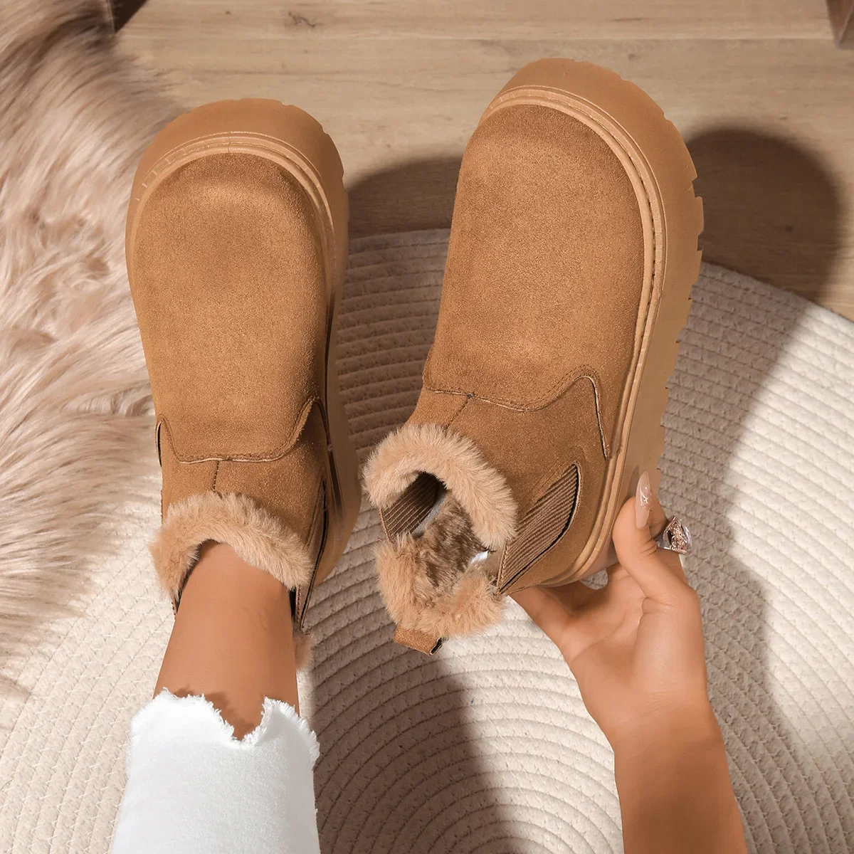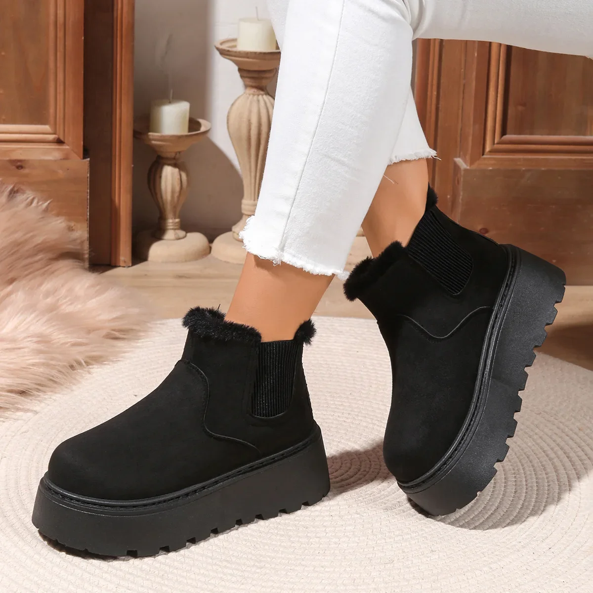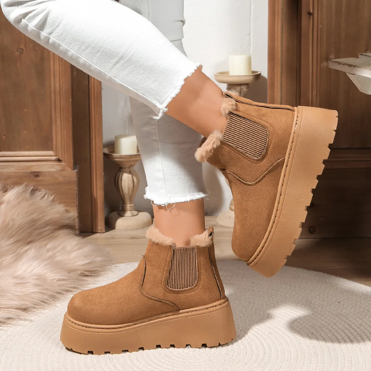 Suede ankle boots with a chunky lug sole for winter comfort and style. Elastic ankle fit ensures easy wear, while insulated lining keeps feet warm. Durable sole offers great traction, making these boots perfect for everyday winter looks.