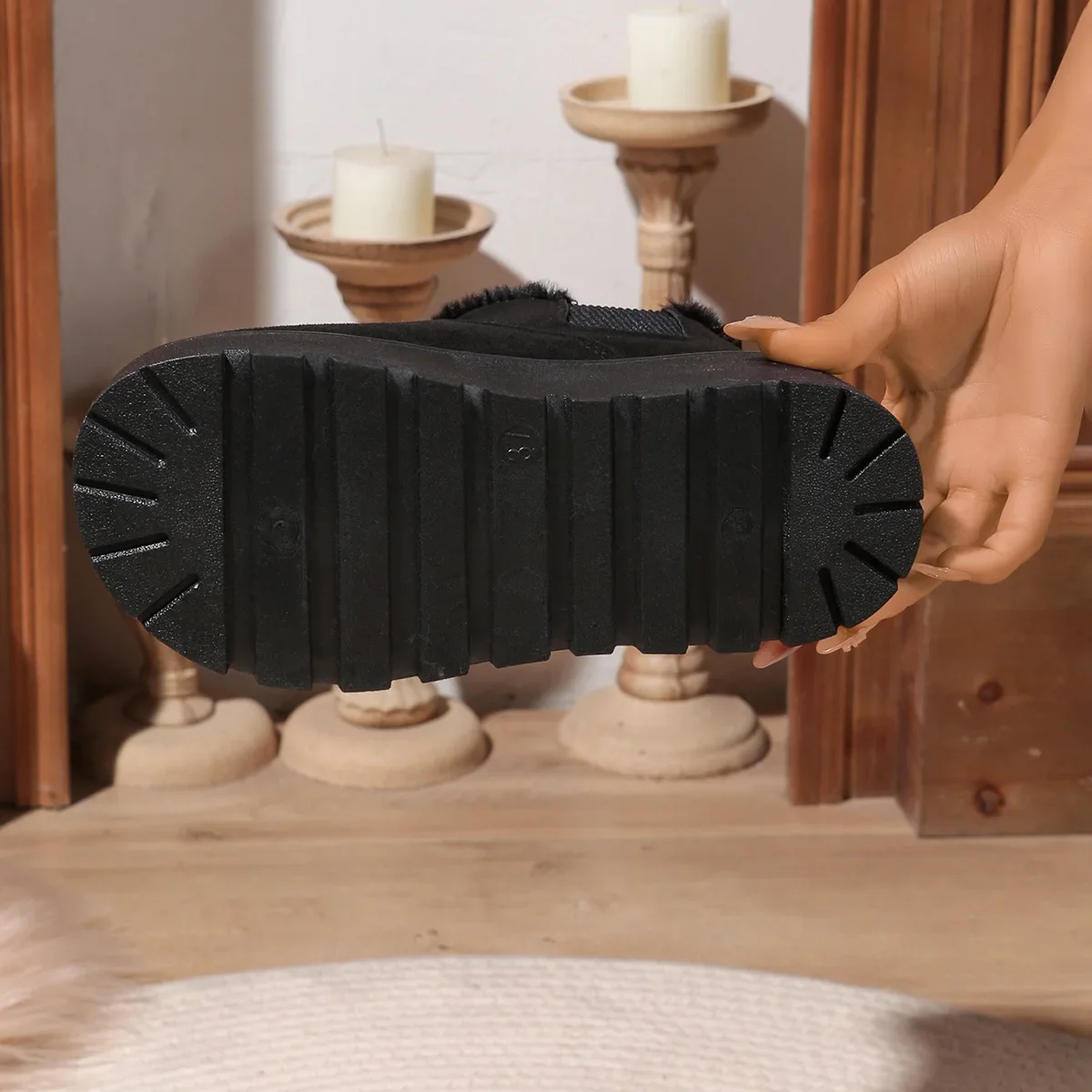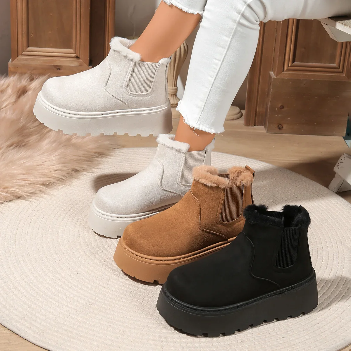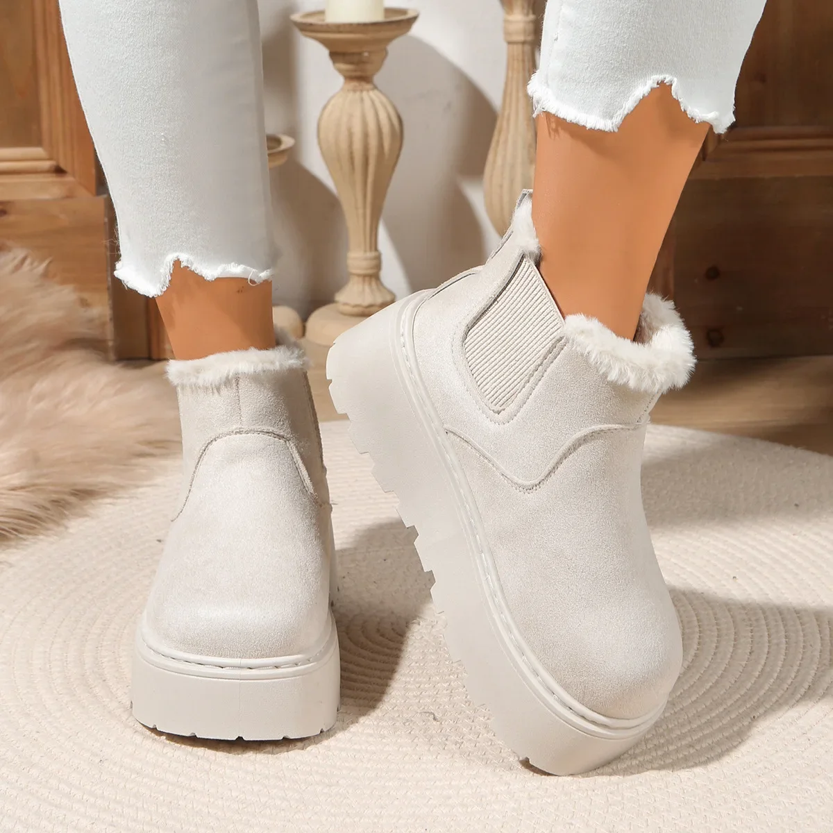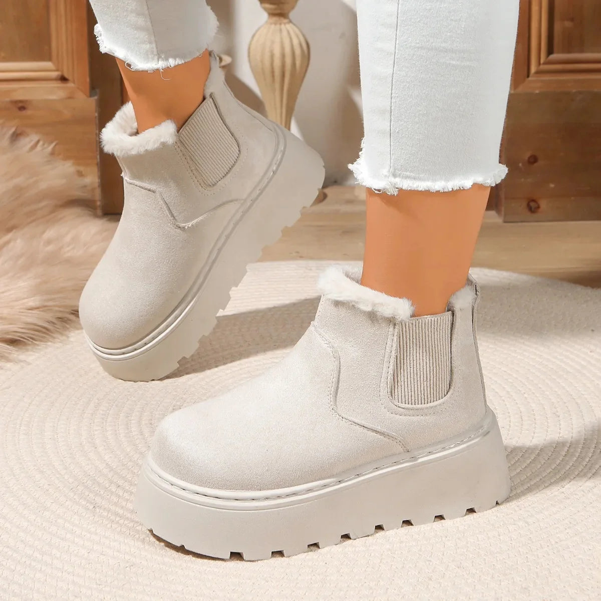 Suede ankle boots with a chunky lug sole for winter comfort and style. Elastic ankle fit ensures easy wear, while insulated lining keeps feet warm. Durable sole offers great traction, making these boots perfect for everyday winter looks.